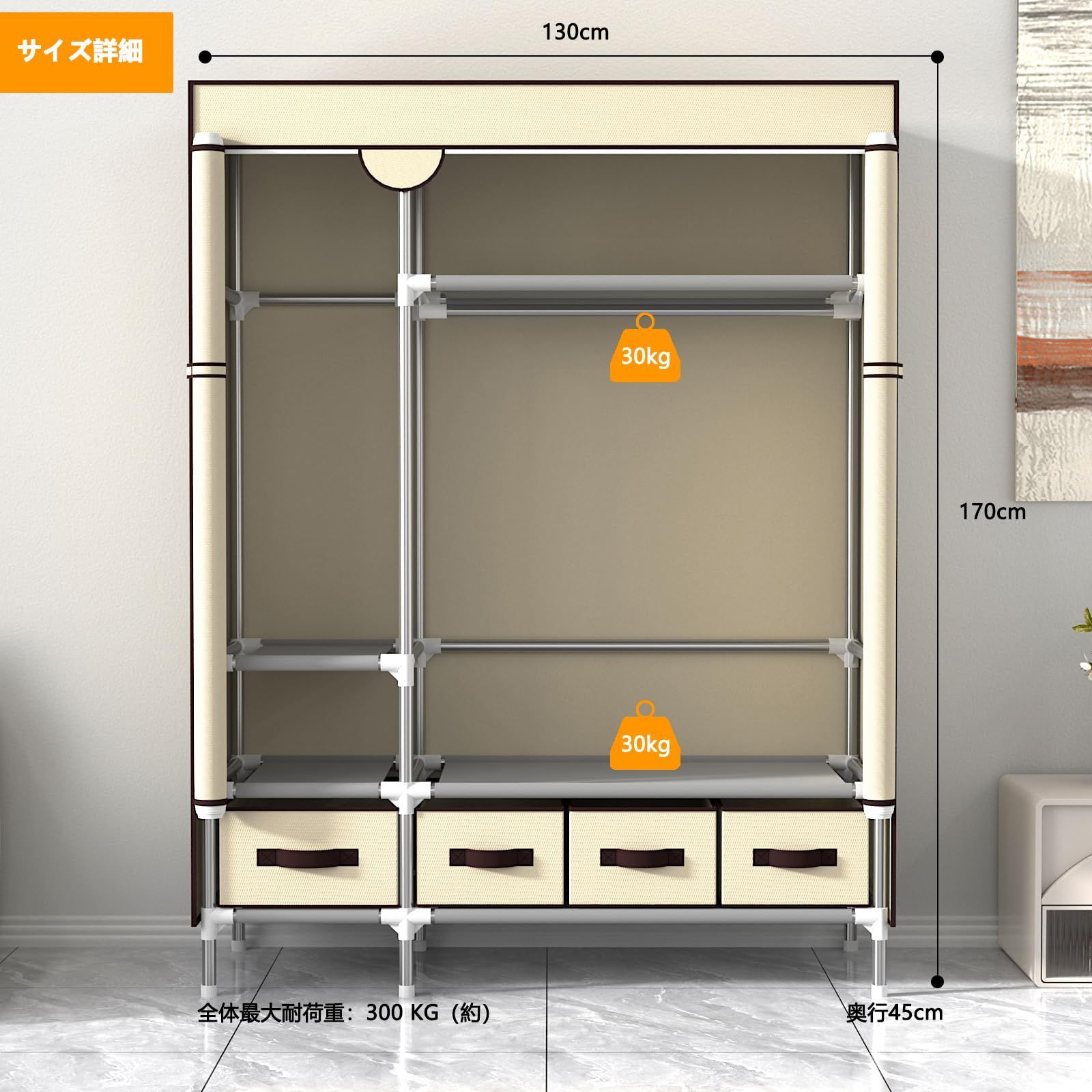 ワードローブ カバー付き クローゼット 引き出し4つ付き 大容量 収納 おしゃれ 不織布 簡単組み立て式 ハンガーラック 収納棚 耐久 頑丈 防水 防塵 防汚 省スペース 幅130 奥行45 高さ170 cm サンドベージュ