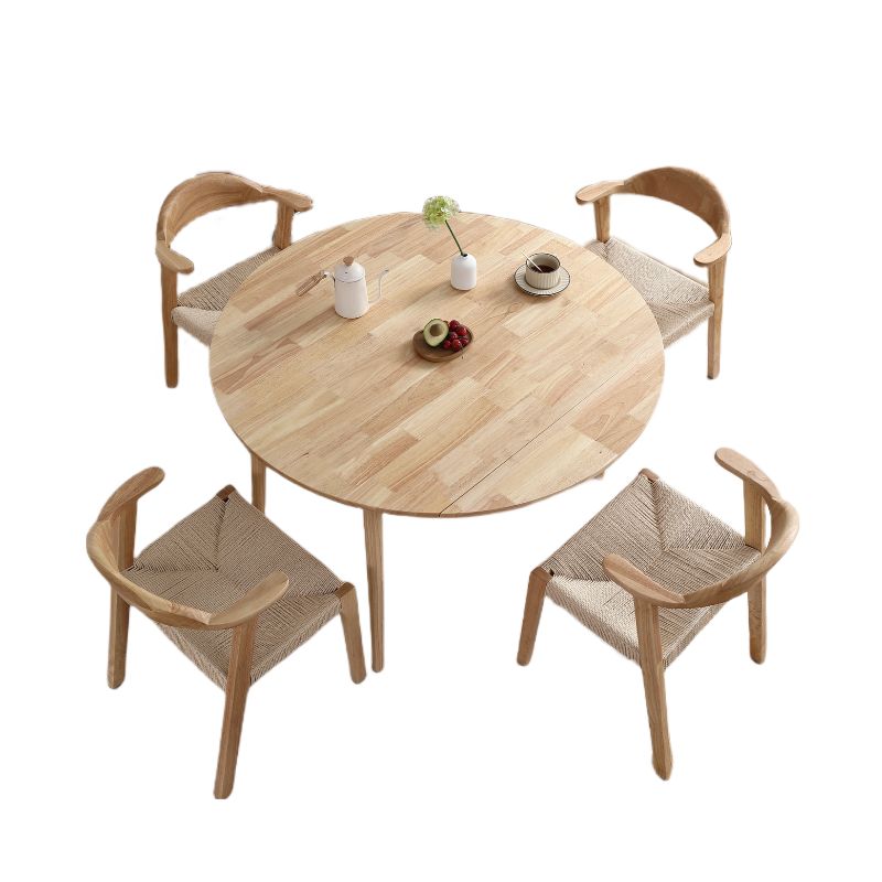 【90-120㎝に伸長する円形ダイニングテーブル】 最大4人での使用が可能。 天板の両側がたためる仕様。 片方を折り畳み半円での普段使い、円形に広げて使用来客や作業に対応。 収納時の折り畳みサイズは幅84*120cmになり、コンパクト収納となる。 天然木を使用し、天板はしっかり面取り加工をしているため、小さなお子様でも安心。