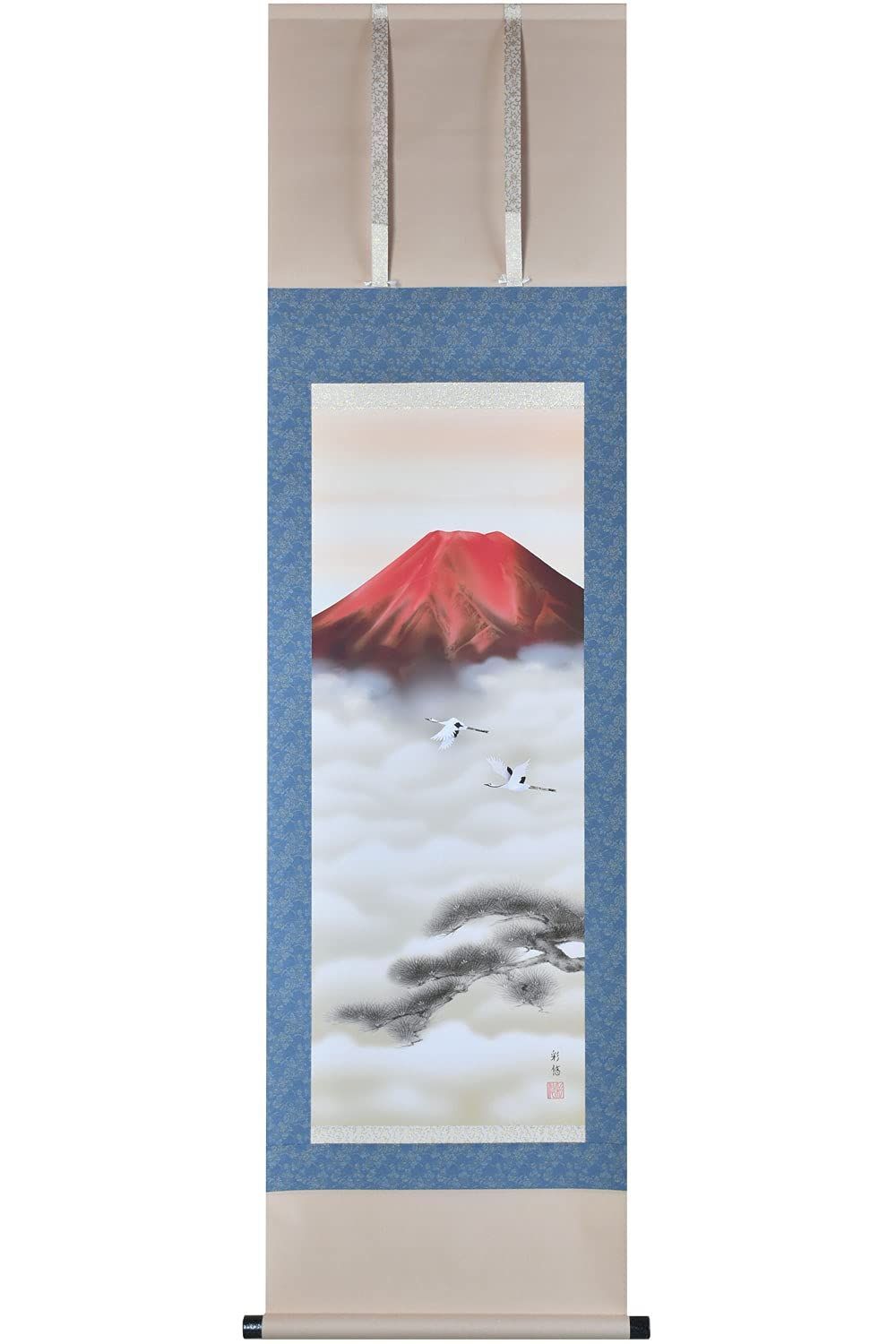 晴れの街ギャラリー 掛け軸 年中掛け 山水画 赤富士双鶴 宇田川彩悠 尺三 幅44 5 x 高さ164 cm