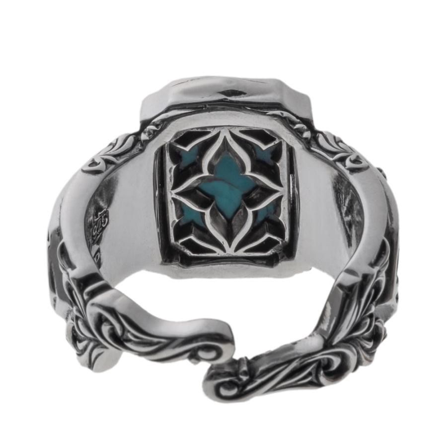 唐草風の透かしで描いた「AC」イニシャルの下に、アマゾナイトカラーのマーブルを敷いた印台リングです。青緑の透け感が光を取り込み、鏡面と燻しのコントラストが彫刻的な奥行きを演出。両脇にはCzクリアを品よくセッティングしました。側面から裏面までクラシカルなトレサリーと唐草の意匠を施し、見えない部分まで美しい仕立て。SV925にロゴ・ホールマーク・「925」刻印入り。厳選された素材と丹念な研磨まで、一貫したクラフトマンシップが永遠の品格を叶えます。重厚で指馴染みの良いフリーサイズ。単体はもちろん、ミニマルなリングとのレイヤードでも存在感を保ち、スタイルに確かな核を与えます。ユニセックスでギフトにも最適です。