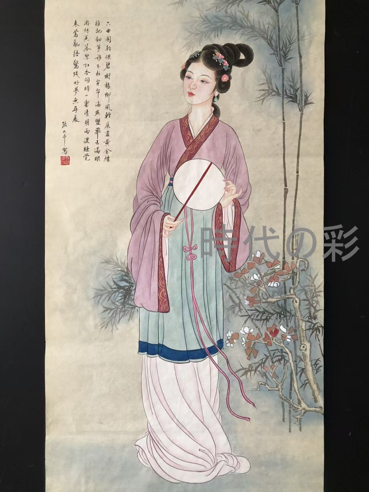 中国古美術 近現代の書画家 張大千作款 仕女図 肉筆保証 四尺 画芯 彩色美人画書画 宣紙 立軸 巻き物 妙墨 時代物 古玩 古美味 唐物 古画