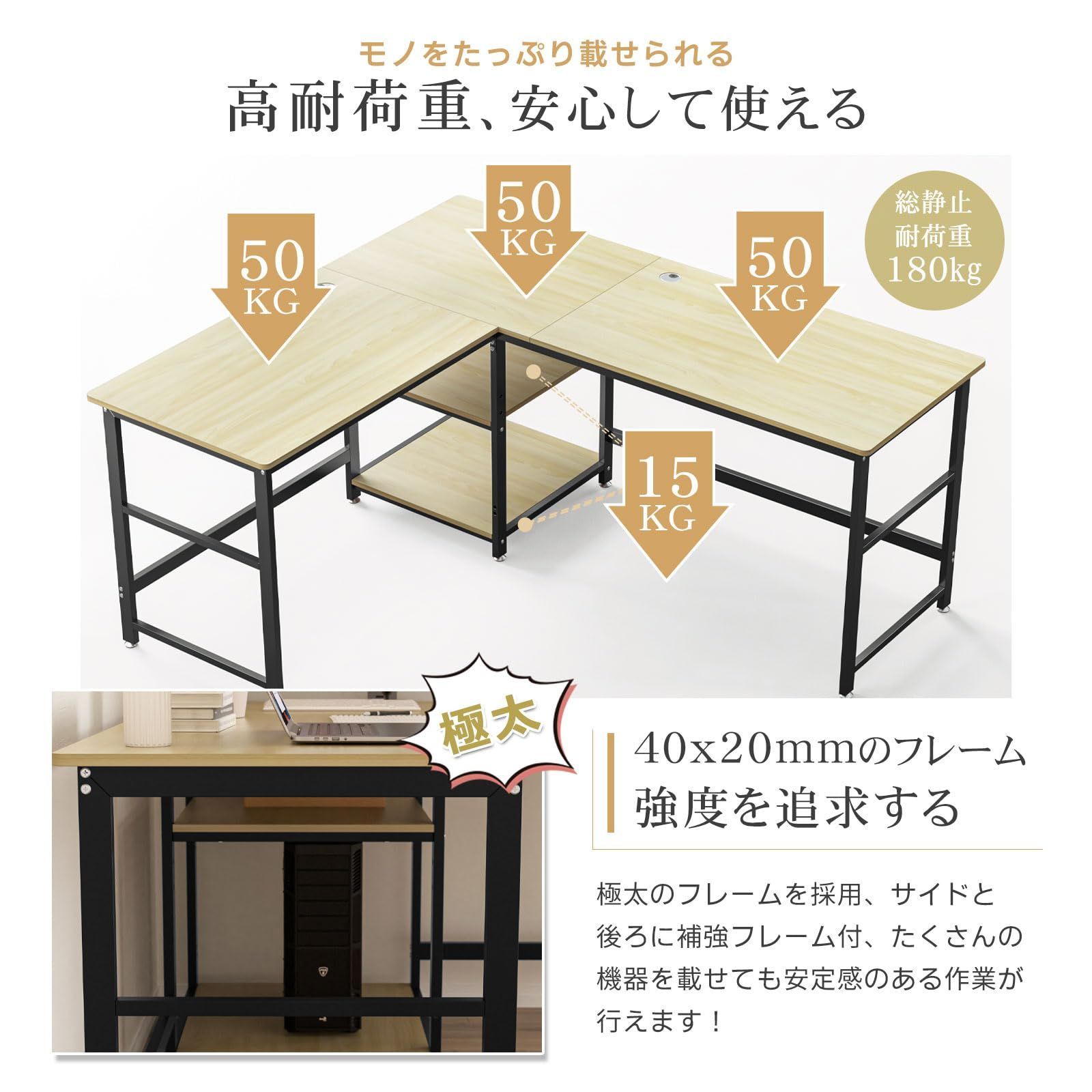 【超ワイドL字デスク&サイドデスク外す可能】◆ゆったり使えるL字型で、幅170+150cm、奥行60cm、デュアルディスプレイはもちろん、パソコンと書類作業を同時に行うこともできます。オフィスだけではなく、ゲーミングデスクとしても大活躍です。◆お好みによって、サイドデスクを外して、棚付きメインデスクのみ使用できます。