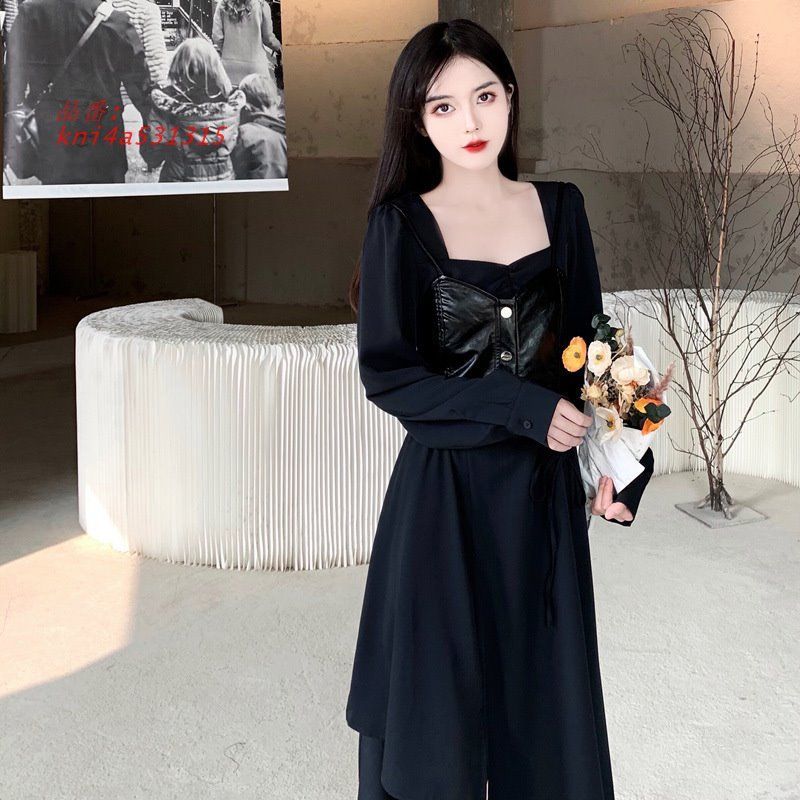大きいサイズ M-5 L 2点セット ワンピース レザー風キャミベスト 長袖 スクエアネック 202111 おでかけ アシンメト膝丈 202112 kni 4 a 531315