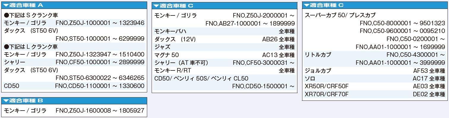 適合車種 モンキー/ゴリラ : Z50J-1600008~1805927 / Z50J-2000001~ / AB27-1000001~1899999 | モンキーバハ : Z50J-1700001~ | ダックス50(12V) : AB26 | ジャズ : AC09 | マグナ50 : AC13 | モトラ : AD05 | シャリー50(AT車不可) : CF50-3000031~ | モンキーR/RT : AB22 | CD50/ベンリィ50S/ベンリィCL50 : CD50-1500001~ | スーパーカブ50/プレスカブ : C50-8000001~9501323 / C50-9600001~0095210 / C50-0200001~ / AA01-1000001~1699999 | リトルカブ : C50-4300001~ / AA01-1000001~3999999 | ジョルカブ : AF53 | ソロ : AC17 | XR50R/CRF50F : AE03