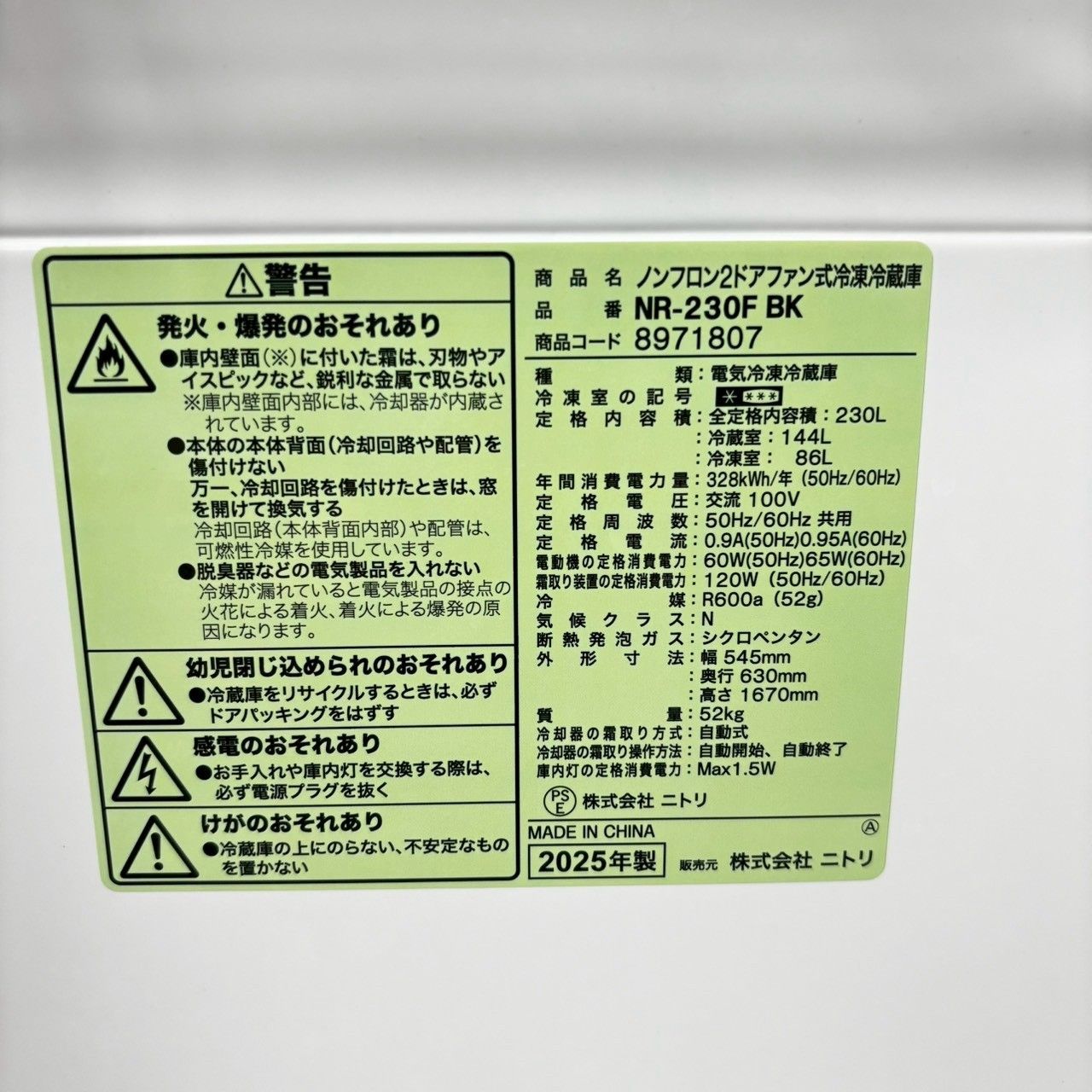 製 NITORI ニトリ NR-230 F BK ノンフロン冷凍冷蔵庫 230 L 2ドア