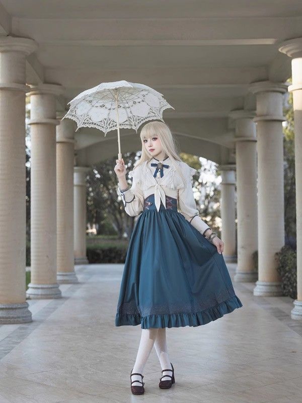 レディース ブラウス ロングスカート イギリス風 長袖 春 秋 学生風 Aライン ハイウエスト 上品 リボン コスチューム 衣装 かわいい 日常着 通学 通勤 お出かけ 仮装 パーティ イベント 小さいサイズ 大きいサイズ ブルー