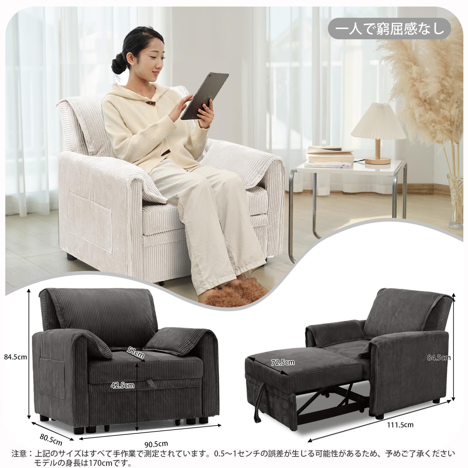 Syuan Kaguソファーベッドリクライニングチェア sofa bed 一人掛け1人掛け引き出し式リクライニング ソファー3 way白グレージンジャー90.5 80.5 84.5 cm コーデュロイ生地 グレー