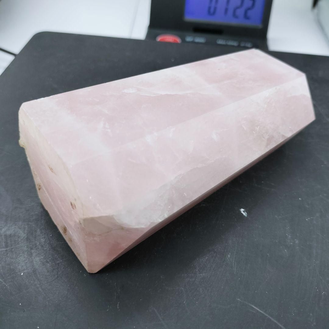 淡いピンクのローズクォーツポイント、722gの重さで、クリスタルの美しさを引き立てます。
