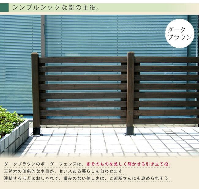 【ボーダーフェンス スプレッド(基本セット/土中用)】新鮮!見栄えが違うボーダーフェンス自分で木製フェンスを設置するなら、断然ボーダーがおすすめです。爽やかでナチュラルな雰囲気があり、モダンにも、スタイリッシュにも、フレンチカントリーにもマッチする使いやすさが魅力。ボーダーの間隔が絶妙で、圧迫感がなく、ほどよい目隠しとなるので、防犯に役に立ちます。気軽に花の水遣りができますね。小さなお子さんも、お庭で安心して遊べそうです。自分で手がけた愛着のある簡単DIYフェンスで、癒しのプライベートガーデンを作りませんか。 ■商品名ボーダーフェンス スプレッド(基本セット/土中用) ※フェンス×1、ポール×2、土中用金具×2 ■カラー・型番 ダークブラウン…SFBF1000F-UB-DBR ホワイト…SFBF1000F-UB-WHT ■サイズ フェンス:幅 約1070×奥行 約27 高さ 約780mmポール:幅 約74×奥行 約74×高さ 約950mm土中用埋め込み金具:幅 約140×奥行 約140×高さ 約460mm ■重量 フェンス:約3.2kgポール:約1.0kg土中用埋め込み金具:約1.6kg ■材質 杉材・天然木 ■仕上げ ステイン塗装 ■組立区分 完成品 ※設置には作業が必要です。 ■生産国 中国 ■備考 ステイン塗装によるホワイト色は、木目や地目が見えるウォッシュホワイト仕上げとなります。画像で判断しにくい部分がございますが、ご注意ください。※北海道・沖縄・離島は別途送料が必要となります。 ■フェンス単品販売 SFPU1200■基本セット(平地用)SFPU1200F-HB■基本セット(土中用)SFPU1200F-UB■連結セット(平地用)SFPU1200E-HB■連結セット(土中用)SFPU1200E-UB ■フェンス単品販売 SFPS1200■基本セット(平地用)SFPS1200F-HB■基本セット(土中用)SFPS1200F-UB■連結セット(平地用)SFPS1200E-HB■連結セット(土中用)SFPS1200E-UB ■フェンス単品販売 SFBF1000■基本セット(平地用) SFBF1000F-HB■基本セット(土中用) SFBF1000F-UB■連結セット(平地用) SFBF1000E-HB■連結セット(土中用) SFBF1000E-UB ウッドフェンス用別売り商品 ■平地用ウッドポール固定金具 単品販売 HBN72■埋め込み用ウッドポール固定金具 単品販売 UBN72■ウッドフェンス用ポール1760(ハイタイプ)単品販売 SFP-1760■ウッドフェンス用ポール950(ロータイプ)単品販売 SFP-950