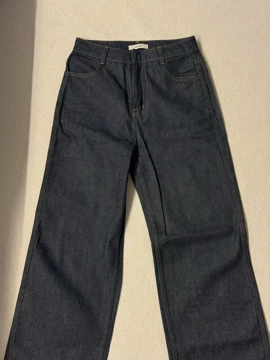 アモメントインディゴストレートデニムは1サイズ展開。買ってから1〜2回着ていますが及び状態はいいです!!!!いい感じ及び硬いです。Amomentoは品質が良いことで有名なので、デニムはかわいく及び丈夫です。約16万ウォンで購入しましたが、お手頃価格で販売されています!