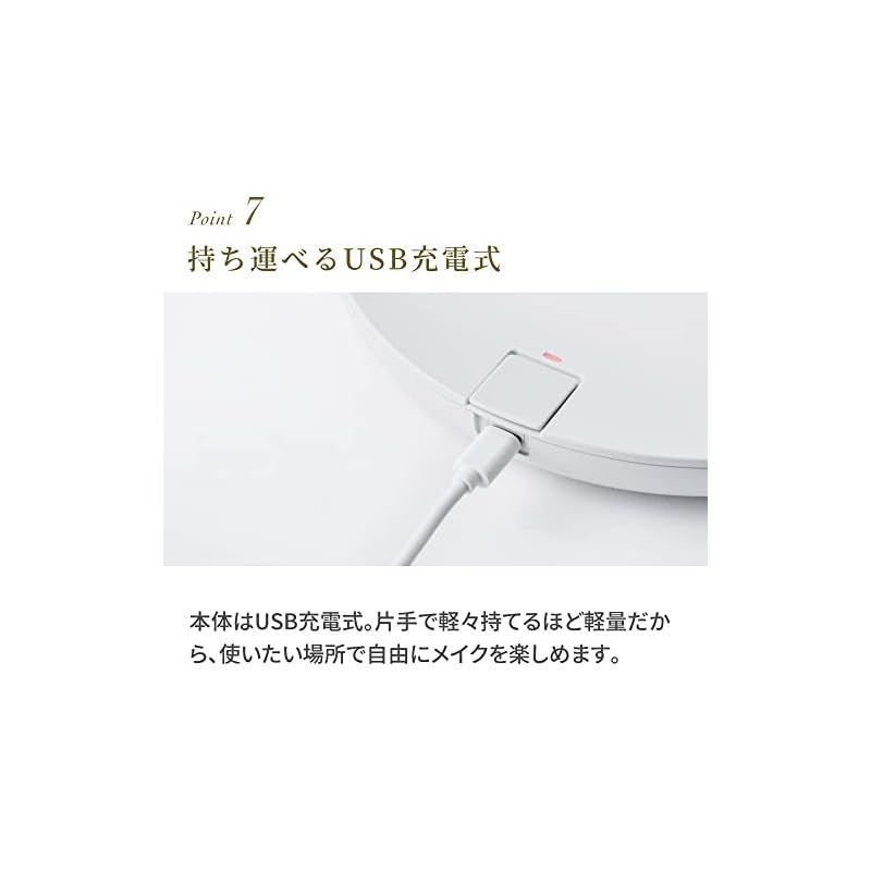 仕上がりに差がつく、キレイな光とふわり風。 ミラーに光と風の相乗効果で、もっと心地良いメイクタイム 肌やメイクの色をクリアに見せるLEDライト&汗ばむ肌をクールダウンする送風ファン搭載。光と風の相乗効果で、メイクの仕上がりもワンランクアップ。 ◆自然光に限りなく近い演出評価数(CRI)*95で、色差をキレイに 自然光に近い演出評価数(CRI)*95の光で、肌もメイクの色味もキレイに映し出します。 *演出評価数(CRI)とは…自然光での見え方と比較して、色をどれだけ忠実に再現できるかの値。値が100に近いほど自然な色に見えます。 ◆ふわりと心地良い風で肌をクールダウン ミラーまわりからの送風は、汗ばむ肌や入浴後の肌を心地良くクールダウン。にじみやすいアイメイクなども素早く乾かします。 ◆スマホや小物が置ける仕切り付きベース スマホやメイク小物、アクセなど立てかけて置ける便利な仕切り付きベース。動画や音楽を楽しみながら充実のメイクタイムを。 ◆メイクに便利な5倍拡大鏡付き 吸盤でミラーに取り付けられるコンパクトな5倍拡大鏡が付属。付け外しが自在で、目元・口元などの細部のメイクチェックに便利です。 ◆角度調節しやすい180度回転ミラー 好きなところでピタッと止まる、角度調節自在の180度回転ミラーだから、作業台の高さを選ばずアイメイクやヘアセットがスムーズにできます。 ◆外部機器の充電ができるUSB給電口付き スマホやスピーカー、充電式のメイク用品など、外部機器への充電ができる便利なUSB給電口付き。 ◆移動ラクラク、USB充電式 本体はUSB充電式。片手で持てるほど軽量で持ち運びもラクだから、使いたい場所で自由にメイクを楽しめます。 ◆ギフトに嬉しいパッケージ 大人かわいいおしゃれなパッケージで、ギフトにもぴったり。