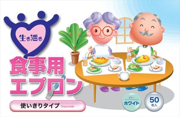 50枚入の食事用ディスポエプロンです。首後ろ両面テープにより簡単に装着ができます。