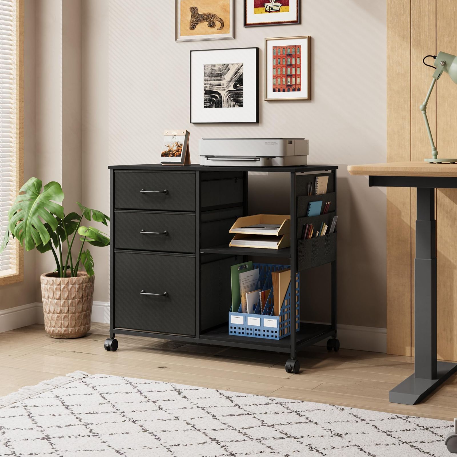 A 4ファイル対応 プリンター台 袖机 移動便利 ファイルワゴン サイドチェスト サイドデスク サイドワゴン サイドポケット付き 引き出し付き キャスター付き ブラック 三段三杯 ファブリック 布製 収納 キャビネット デスクワゴン DEVAISE
