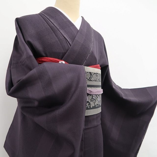 艶めいた深紫色の地全面に描き込まれた洗練モダンなラインデザイン、アシンメトリーな構図で縦横に走るその表情は正に“創作着物の粋な奥行”そのもの、ダイレクトにお召の温もりを感じさせてくれるひと品…独特のしっとりとした風合いが着物の味わいを一段と馴染みやすい趣に変えています。