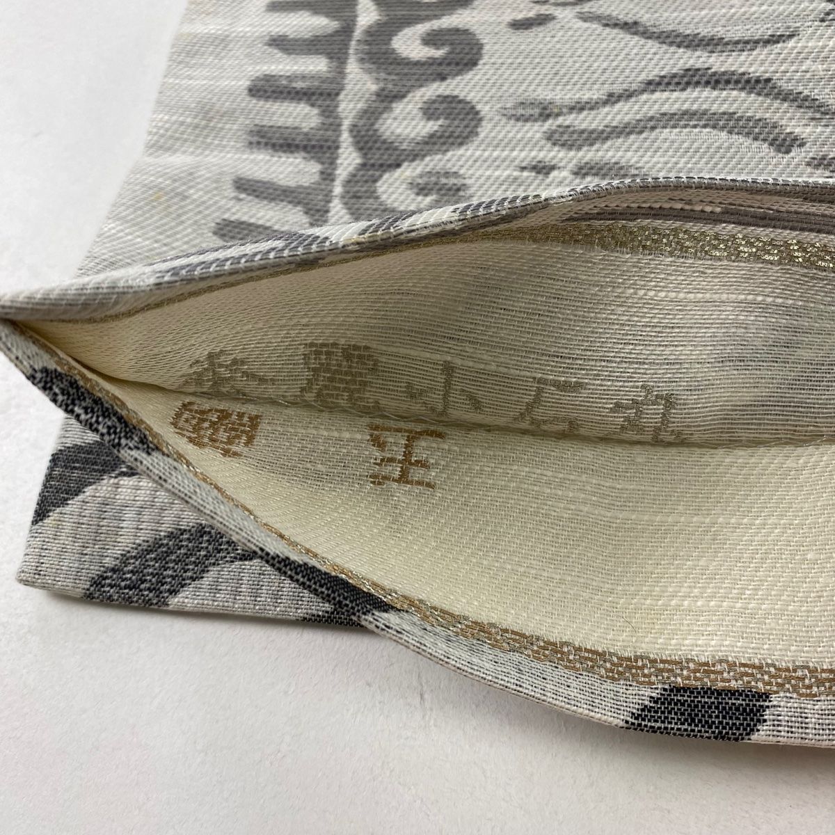 袋帯 蚕麗小石丸 動物 幾何学 灰色 お太鼓柄 正絹
