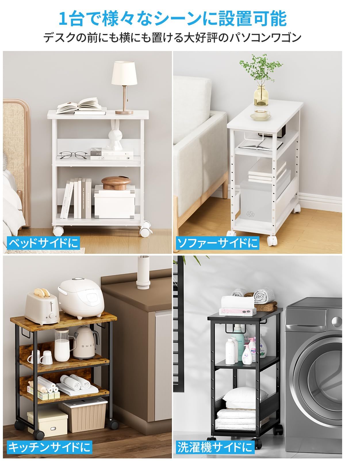 デスクと合わせて自由で配置可能:配置を変えてデスクの横幅を拡張でき、拡張型のデスクとしてもでき、作業スペースを拡張できます。お使いのデスクの横に設置することでL字テスクにもなります。天板を低めにして、PCを入れて、デスク下にぴったり収まるpcワゴンです。