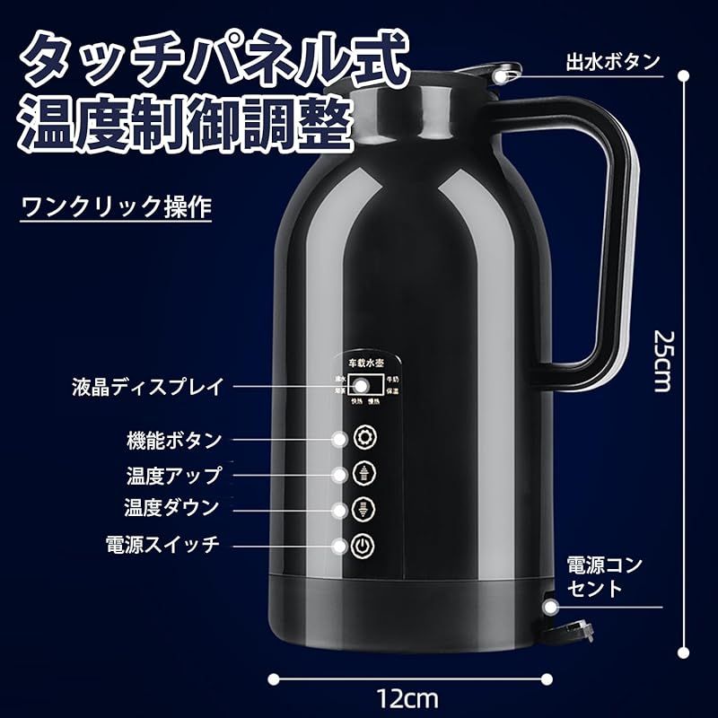 【運転中でも安心】360°循環加熱技術で均一に加熱し、過熱防止機能も搭載します。ボタン式給水でこぼれ防止、静音設計で運転の邪魔になりません。赤ちゃんのミルク用の45℃から、コーヒーに最適な80℃まで、温度調節可能で多様なニーズにお応えします