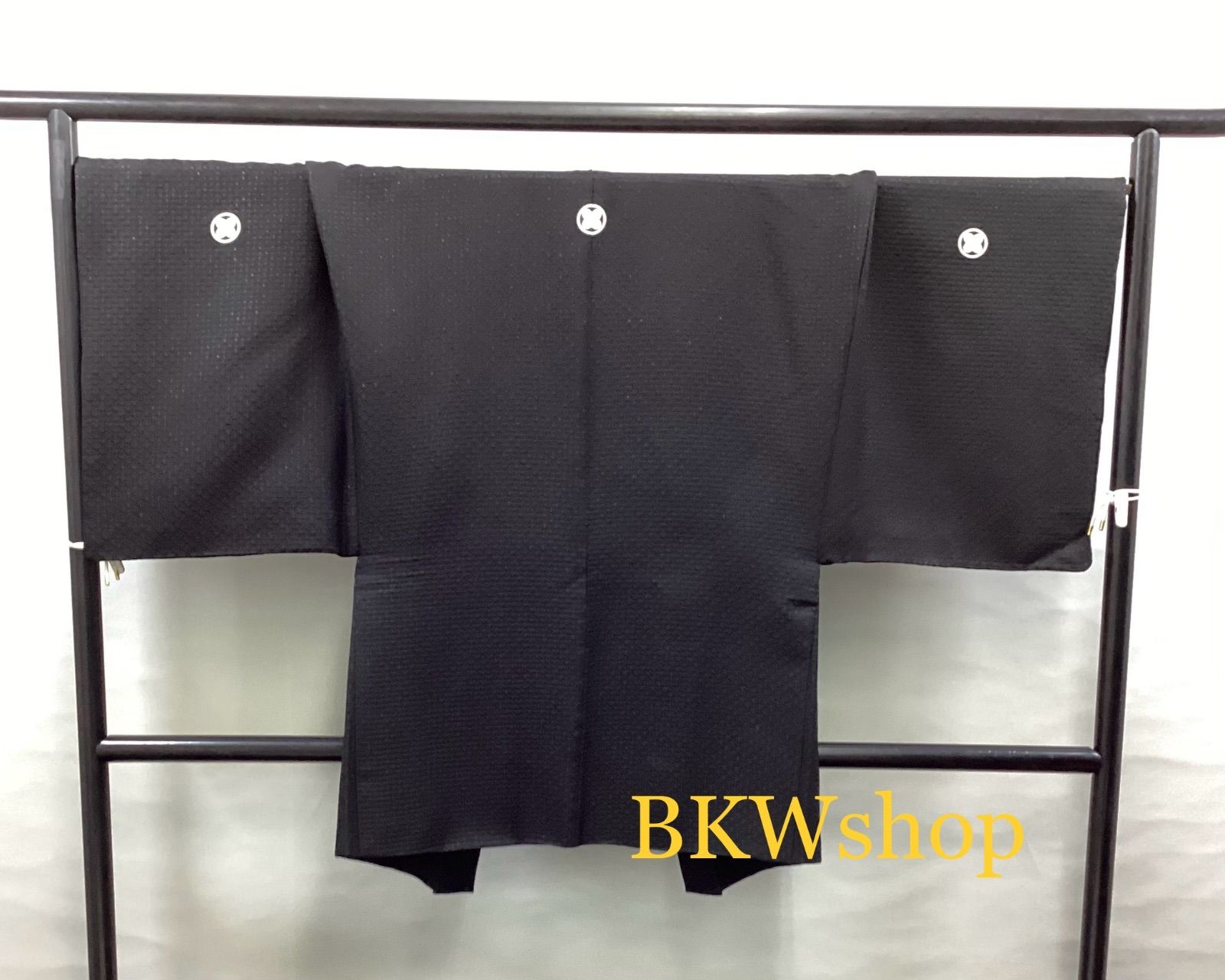 新品 正絹 紋付 羽織・着物 黒地 (刺子生地) 丸に違い鷹の羽 2.25寸 2点セット 5つ紋 紋付 でございます。