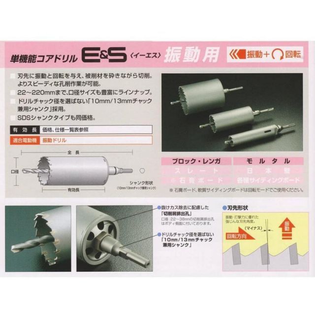 用途:ブロック・レンガ・モルタル適合電動機:振動ドリル10mm・13mmチャック兼用シャンク(SDS)寸法/口径:70mm、全長:288mm、有効長:135mm