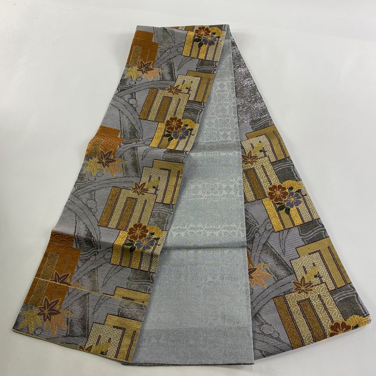 袋帯 関西仕立て 源氏香 楓 箔 黒灰 六通 正絹