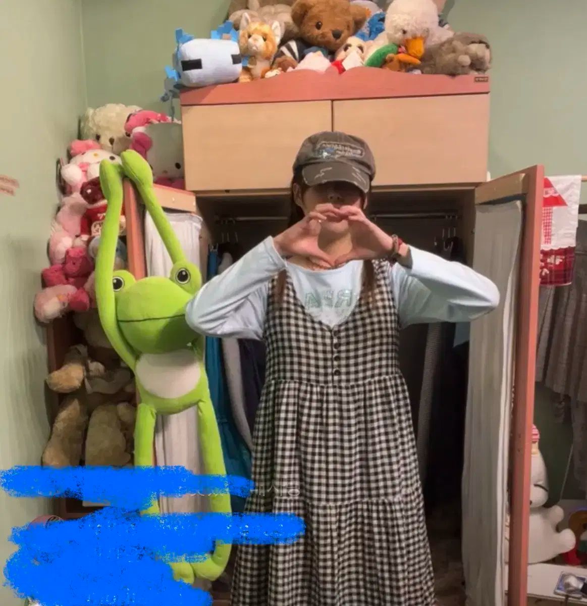 かもめ山荘ワンピースセットで販売します。トーンダウンした水色のロングスリーブとチェック柄ワンピースに帽子までセットです。
