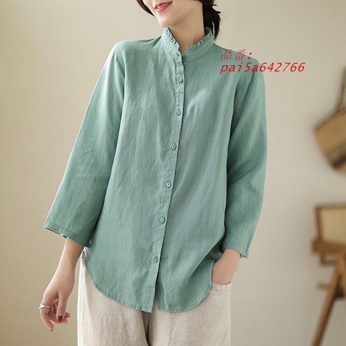 お取寄せ レディース ワイシャツ フリル襟 7分袖 薄地 夏 前開き チュニック ゆったり 無地 着心地良い カーディガン リネン ル 綿麻 春 pai 5 a 642766