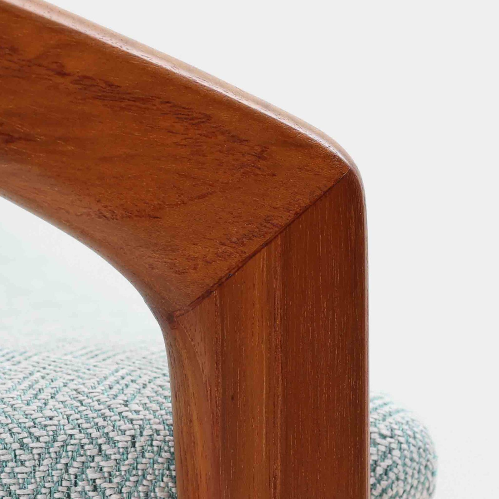 Henning Kjaernulfがデザインし、Korup Stolefabrik社より発表されたアームチェア「Model 23」です。チーク材のアームから脚部へと流れるようなラインが美しく、北欧家具らしい軽やかさと存在感を兼ね備えています。座面と背もたれは新たに張り替え済みで、落ち着いたトーンが上品な雰囲気を演出します。快適な座り心地と端正なデザインは、ダイニングや書斎はもちろん、リビングのアクセントチェアとしても活躍し、経年変化による風合いがビンテージならではの魅力を引き立てています。