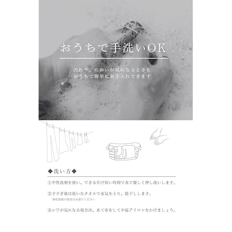 中性洗剤でできるだけ短い時間で水で優しく押し洗いしてください。すすぎ後は乾いたタオルで水気をとり陰干しをしてください。乾いた後のシワはあて布をして中温アイロンをかけてください。