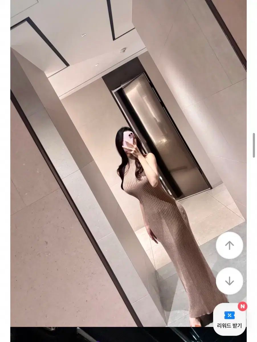 ベージュのリブニットロングドレス。ほのかなゴールドパールが入っているので、高級感があります。体にフィットするデザインなので、ラインが綺麗に見えます。