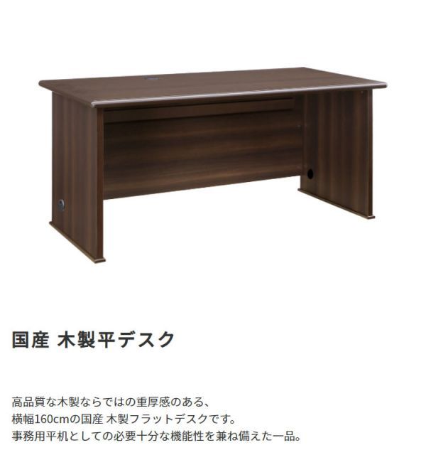 説明高品質な木製ならではの重厚感日本一の家具の町、大川のメーカーと共同開発した、横幅160cmの国産木製フラットデスクです。高品質な木製ならではの重厚感と、事務用平机としての必要十分な機能性を兼ね備えた、まさに伝統と革新を併せ持つ、自慢の一品。天板と側面にコードホール加工が施されており、雑多になりがちな電源コードやLANケーブル、電話線などのコード類を、見た目もスッキリと収納できます。