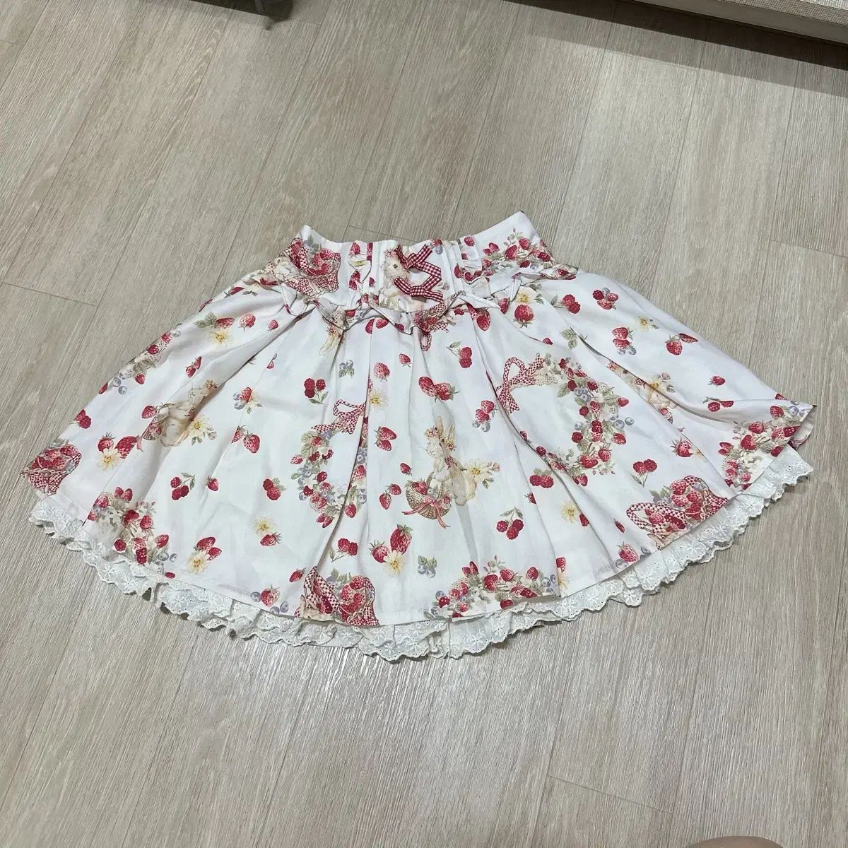 これは素敵なリズ・リサ・レビットのスカートです。優しいレースのディテールとストロベリー柄が見どころです。ウエストボンでサイズを調節できます。ご不明な点がなければ、すぐに安心してお支払いいただけます!