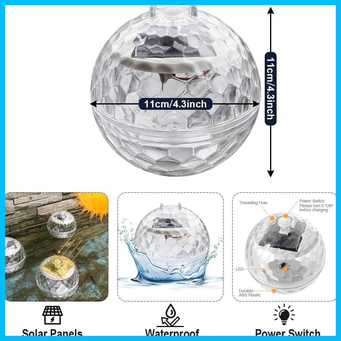 【ソーラー充電&自動照明】 このプールランプは太陽エネルギーを使用し、インテリジェントな光感知機能を備えています。昼間に自動消灯して、ソーラーエネルギーを吸収し自動充電されます。夜間などパネルの周りが暗くなるとプールーライトが自動的に点灯します。ご注意:充電する場合は、必ず電源を入れた状態で太陽光に当ててください。昼間自動充電、約6時間の充電時間。夜間自動点灯、6~8時間の長時間照明。