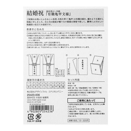 仕様サイズ1枚入〔中袋(大阪折)付〕表書きと包み方解説付金額目安:10〜30万円/本体サイズ/H195×W120mm