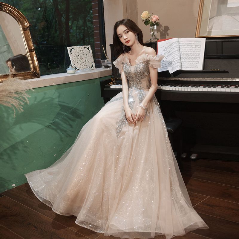 2025年最新デザインの一字肩ロングフォーマルドレスです。気品あふれるシルエットで、名媛スタイルや司会者、宴会や年会、パーティーなど幅広いフォーマルシーンに最適。優雅で幻想的な雰囲気を演出します。