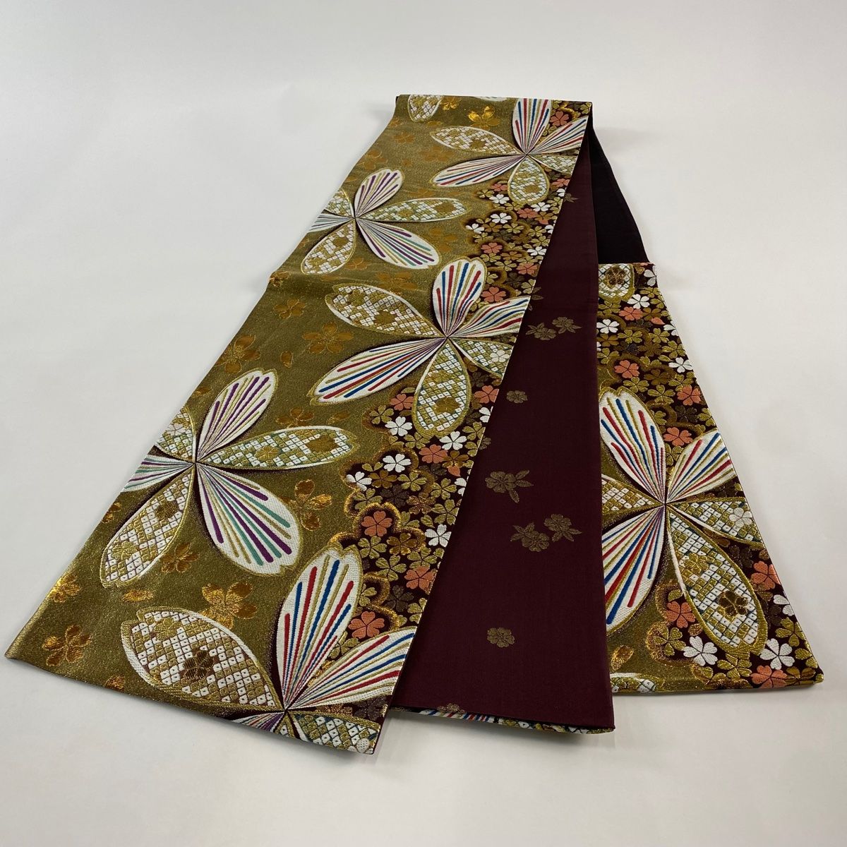 袋帯 秀品 振袖向き 桜 疋田 金糸 箔 茶緑色 六通 正絹