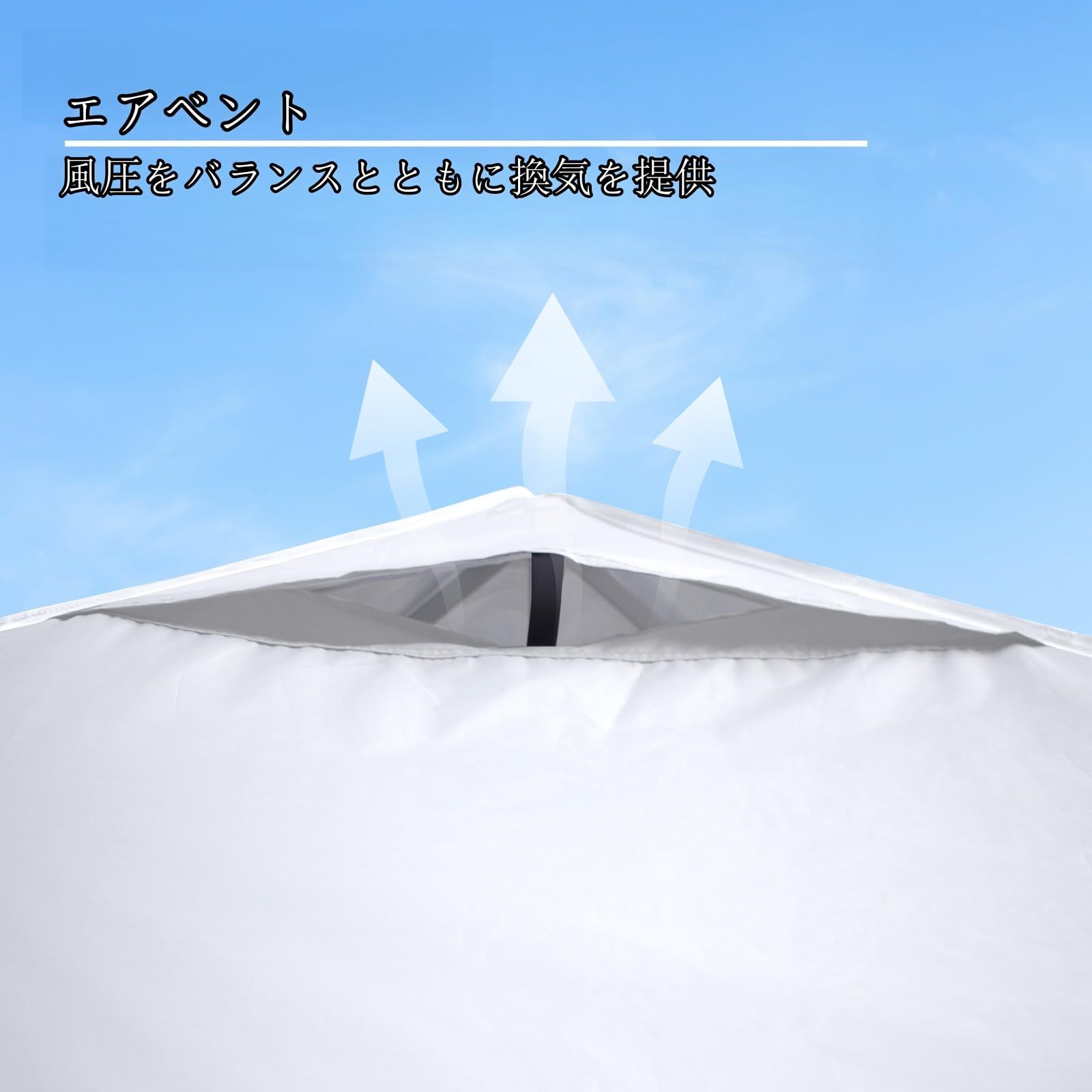 優れた通気性と遮光・遮熱性能:3x6m タープテント専用トップカバー(キャノピー交換用)には通気孔が内蔵されており、3x6m タープテントの内部にこもった熱を効率的に放出し、涼しさを維持します。さらに高い遮光・遮熱効果を発揮し、強い日差しをしっかり遮って内部の温度上昇を抑制。同時に風の抵抗を軽減することで、強風時でもタープテントが地面にしっかり固定されます。