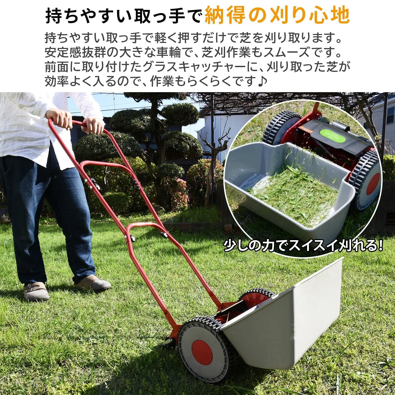【特徴】音が気になりにくい手動式の芝刈り機です。組み立て簡単で専用の工具もいらず、ハンドルをボルトで固定してグラスキャッチャーを取り付けるだけですぐに使用できます。少しの力でスイスイ刈れ、初心者の方でも使いやすくて安心です。刈込の高さは約10・16・23・30・36mmの5段階に調節でき、ハンドルの高さはお好みに合わせて、約114.5・118cmの2段階に調節できます。持ちやすい取っ手は軽く押すだけですいすい芝を刈り取ります。安定感抜群の大きな車輪で芝刈り作業もスムーズです。前面につけたグラスキャッチャーに刈り取った芝が効率良く入るので作業もラクラクです。
