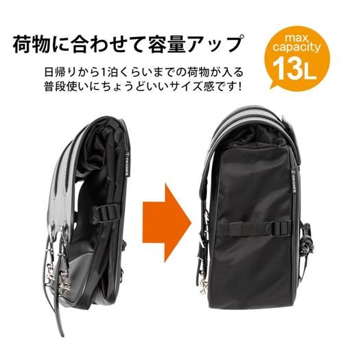 荷物に合わせて容量アップ。サイドのベルトで厚みが調整いただけます。