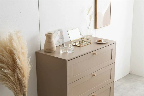 品のある框(かまち)デザインと柔らかなニュアンスカラーが印象的な『Calan(カラン)』シリーズのチェスト。