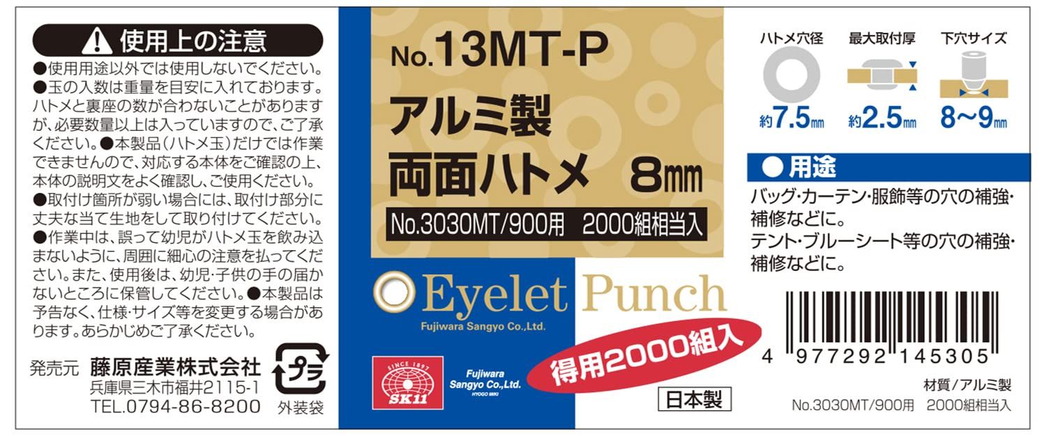 SK 11 エスケー11 両面ハトメ玉 アルミ 8 mm 2000組相当入 No.13 MT-P