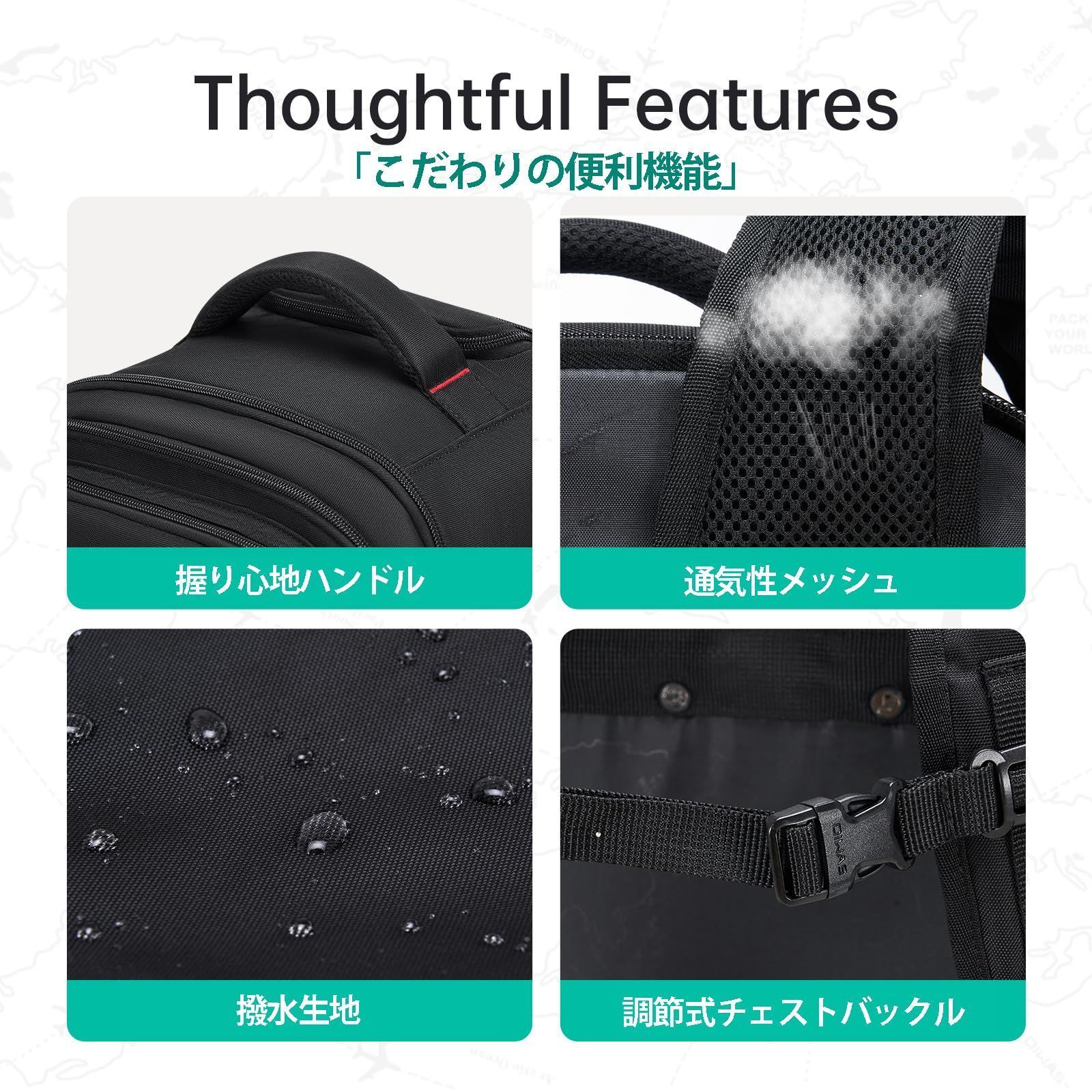 【隠したショルダーベルトデザイン】トラベルバッグの裏面で、隠したショルダーベルトがあります。また、ショルダーベルトにバックルが搭載されており、バックルの長さを調整することでストレスを軽減できます。駅の階段を急いで走る時など、いくつかのステップだけでキャリーバッグからリュックへの切り替えが早くでき、非常に便利です。