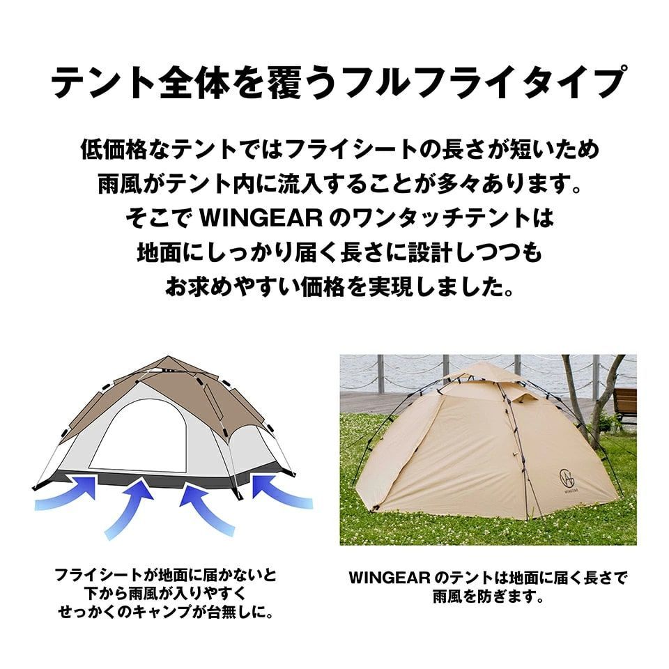 そこでWINGEARのワンタッチテントは地面にしっかり届き雨風を防ぐ長さに設計しました。