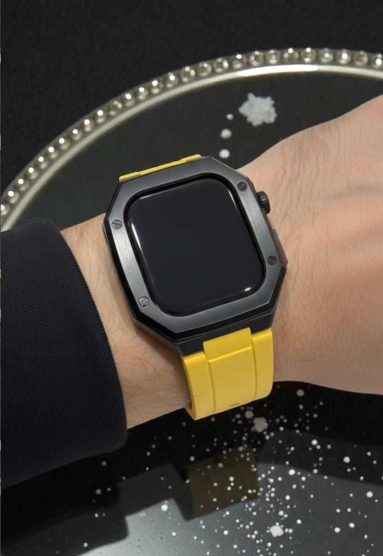 ブラックイエロー 新型モデル モデル ワンタッチ アップルウォッチ カスタム ケース カバー メタル ラバーバンド ベルト スクリューレス設計