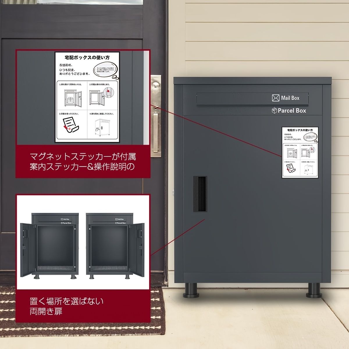 盗難防止機能付きで、不在時でも安心して荷物を受け取れます。二方向開閉式なので、設置場所や荷物のサイズに合わせて柔軟に対応可能です。個人宅に最適な設計で、玄関先をスマートに演出します。