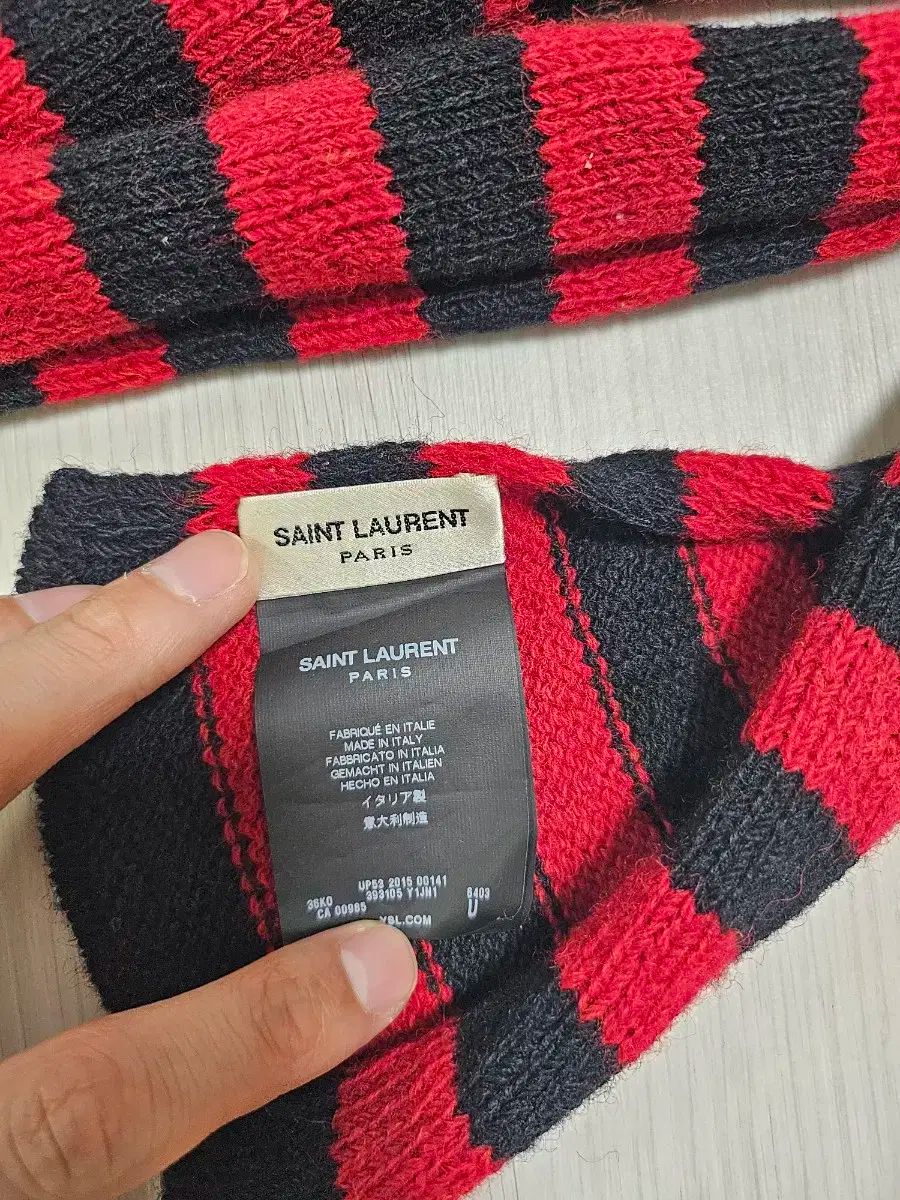 これはサンローランの15fwマフラーです。黒/赤のストライプ柄が目立ちます。ポイントを与えるのに良いアイテムです。