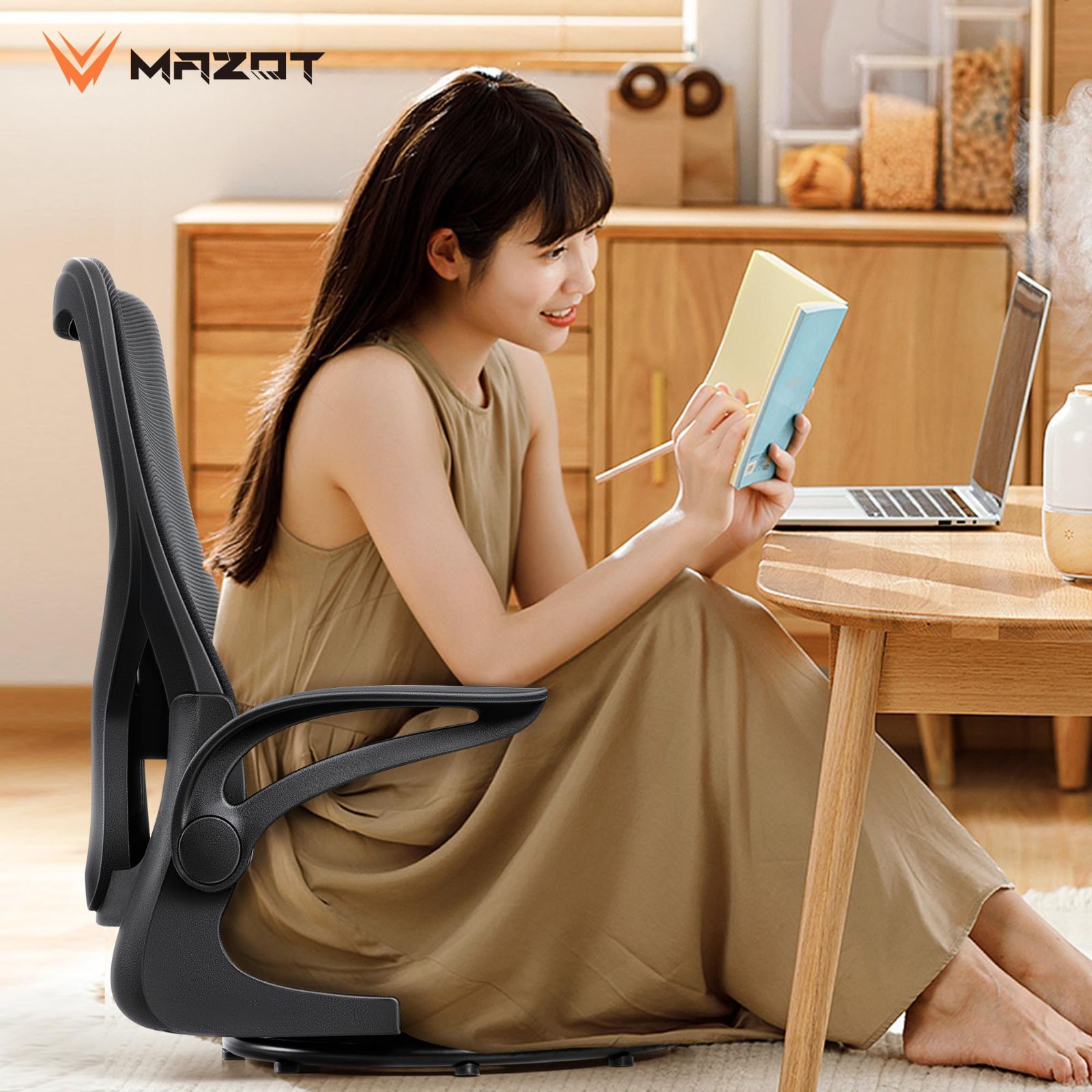 和室オフィスチェア メッシュ 人間工学 椅子 通気性 腰痛対策 疲れない 10分簡単組み立て デスクチェア 360度回転 回転座椅子 座椅子 ブラック MAZOT