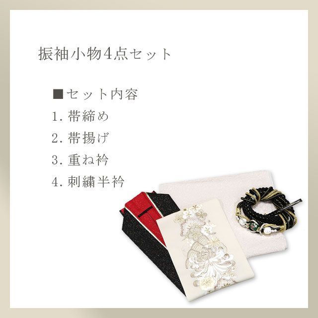振袖用小物4点セット 帯揚げ 帯締め 重ね衿 刺繍半衿 白系×黒 赤コーディネート 成人式 結婚式 前撮り