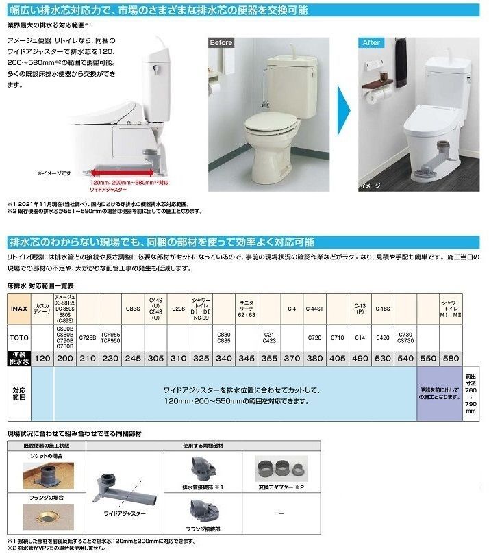 ※排水芯551〜580mmの場合、便器を1〜30mm前に出しての施工となります。