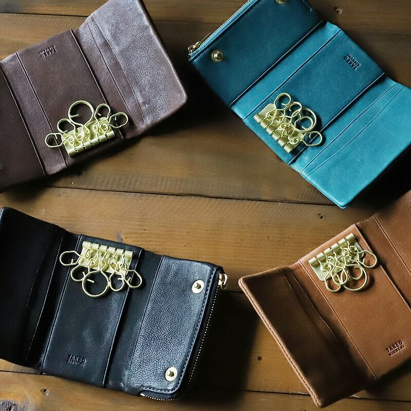 手に馴染み吸いつくような柔らかなタッチ感と革らしい味わいある表情が魅力のシープスキンを素材に使用。鞣し段階でオイルを浸透させているので、柔らかなタッチ感にプラスされるしっとりとした風合いも魅力。革特有の経年変化も楽しめます。縫製は素材感を活かした袋縫いを採用し、手に馴染む風合いがより堪能出来ます。ファスナーやメタル類は本体素材同様の味わい深く、クラシックなテイストの真鍮カラーを使用しTAKEO KIKUCHIらしさを演出。内装生地には素材感あるタンガリー生地を使用。カジュアルなテイストで、強度に優れ本体素材同様の経年変化も味わえます。キーフックは5連。外側のファスナーポケットは小銭やスマートキーの収納が可能。内装にはカードポケットも装備しており、使い 勝手の良い作り。ブランドボックス付きなので贈り物にも最適です。