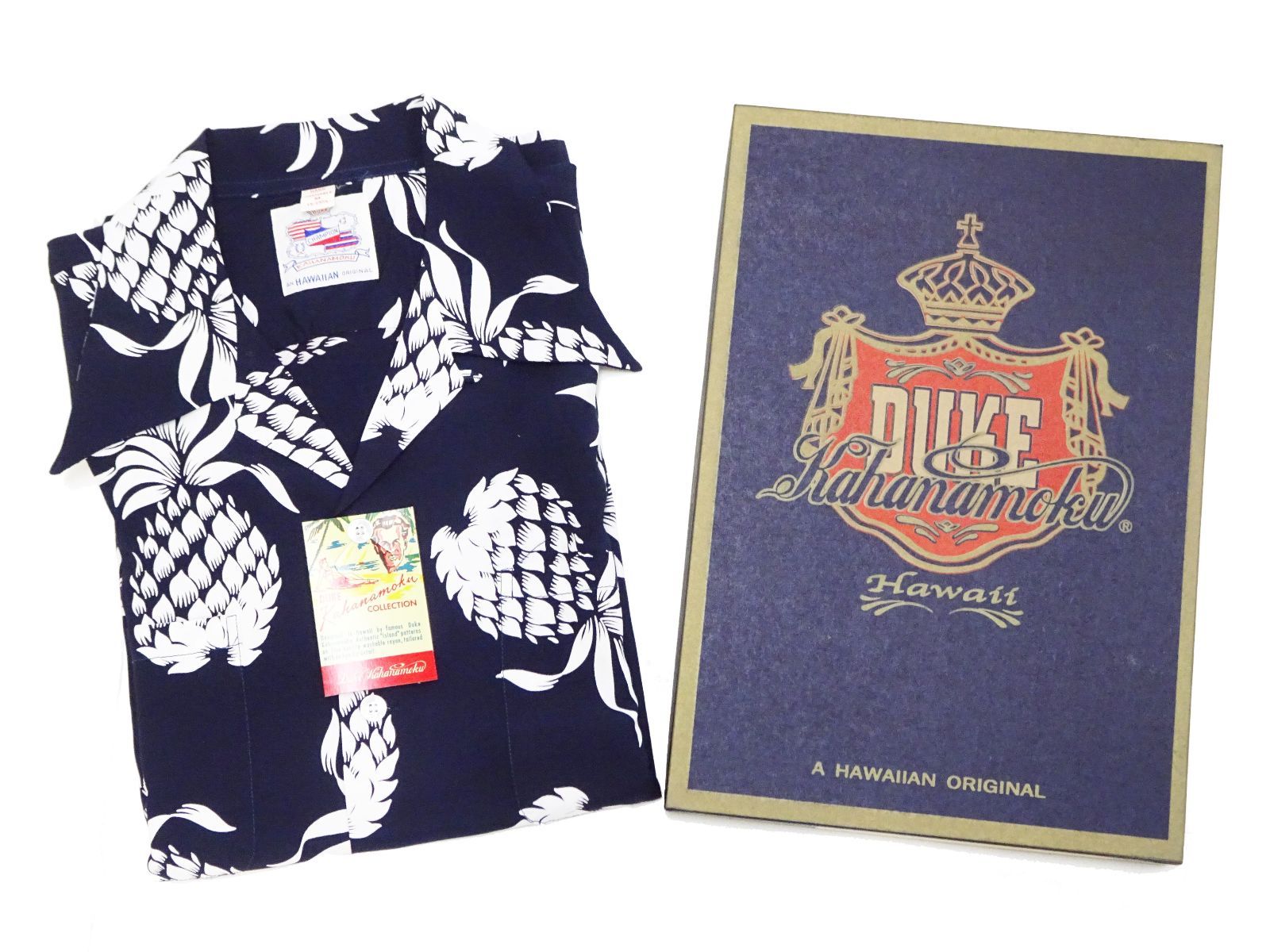デューク カハナモク DUKE パイナップル柄 スペシャルエディション アロハシャツ DK 36201 半袖シャツ 東洋エンター 箱入り デュークス パイナップル S PINEAPPLE ネイビー
